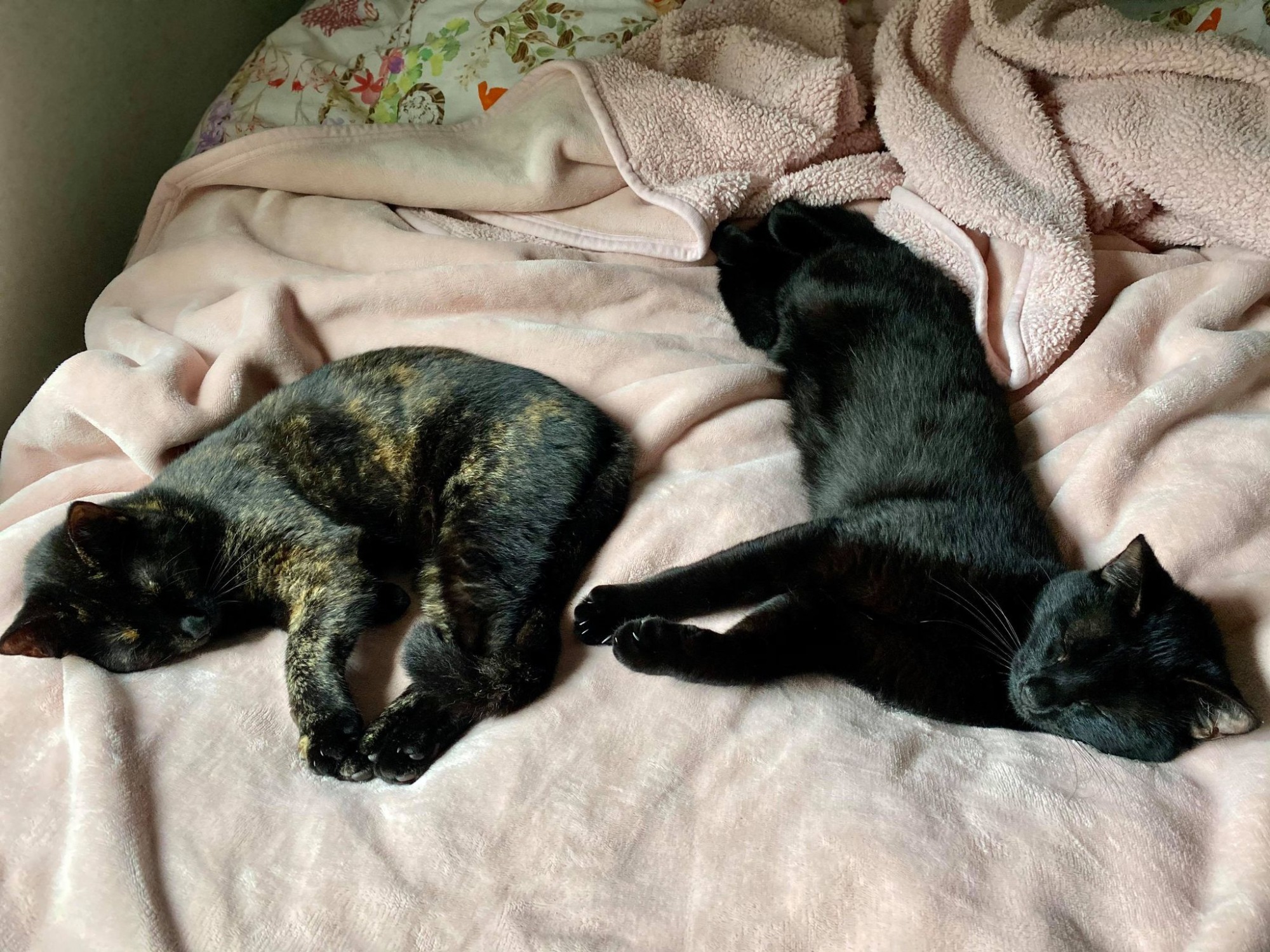 Stevie is what I call a 'Crunchie' cat - black with flashes of honeycomb. They just love to play, the whole world is one massive game. Then after giving each other an adoring bath they will zonk out.