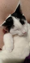 A sweet, shy kitten who loves to explore and play. She loves to rough play with other cats but also loves to get pats and butt scruffs from her humans once she gets to know them.