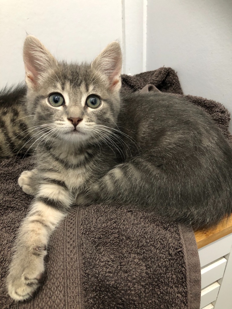 This feisty little kitten loves to run and play all day long! He has a big purr to match his big personality.