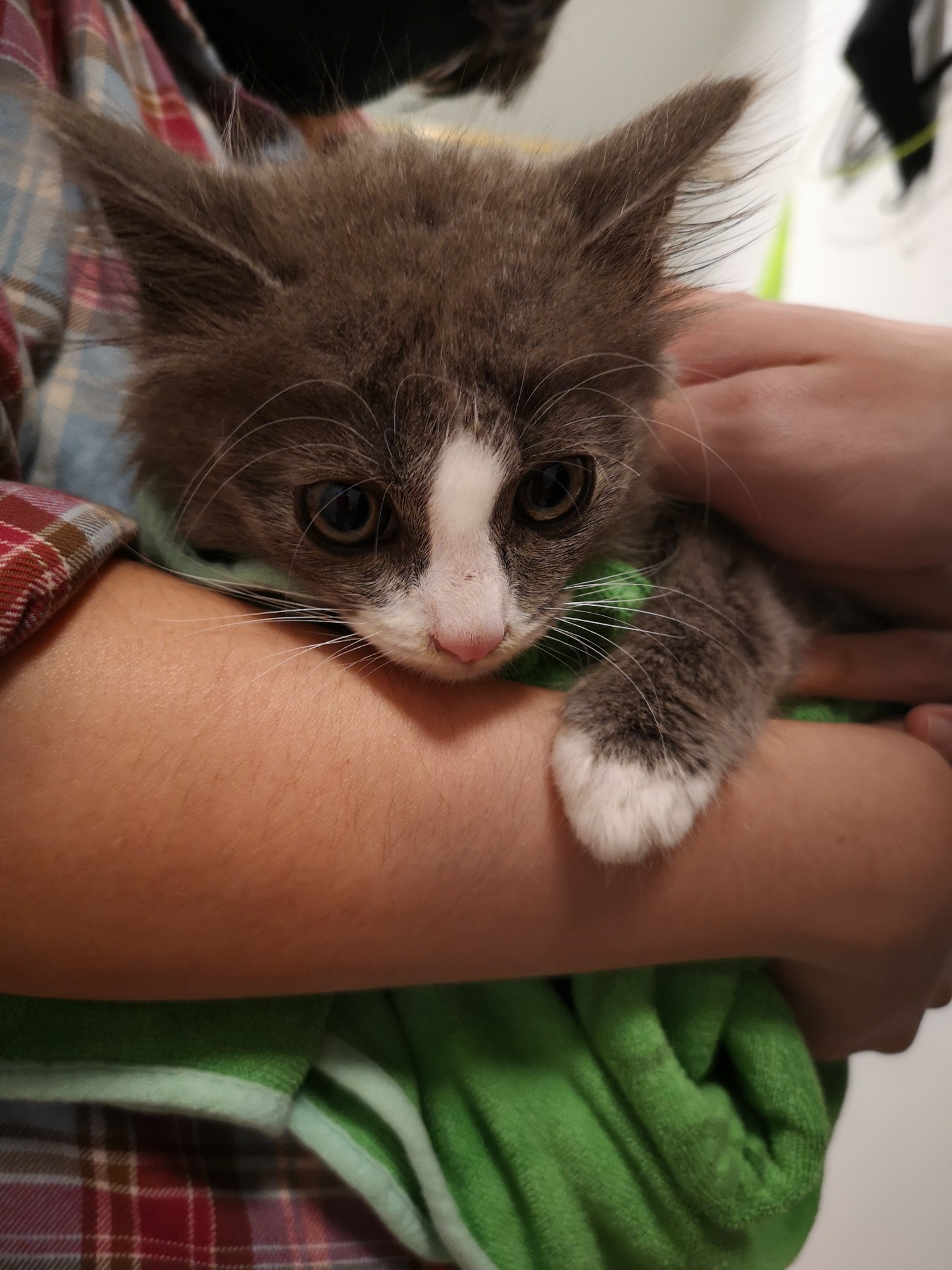 Tiktok is a beautiful sweet grey and white boy who was found on a busy road in Chester Hill with three siblings, one of whom sadly didn't make it.