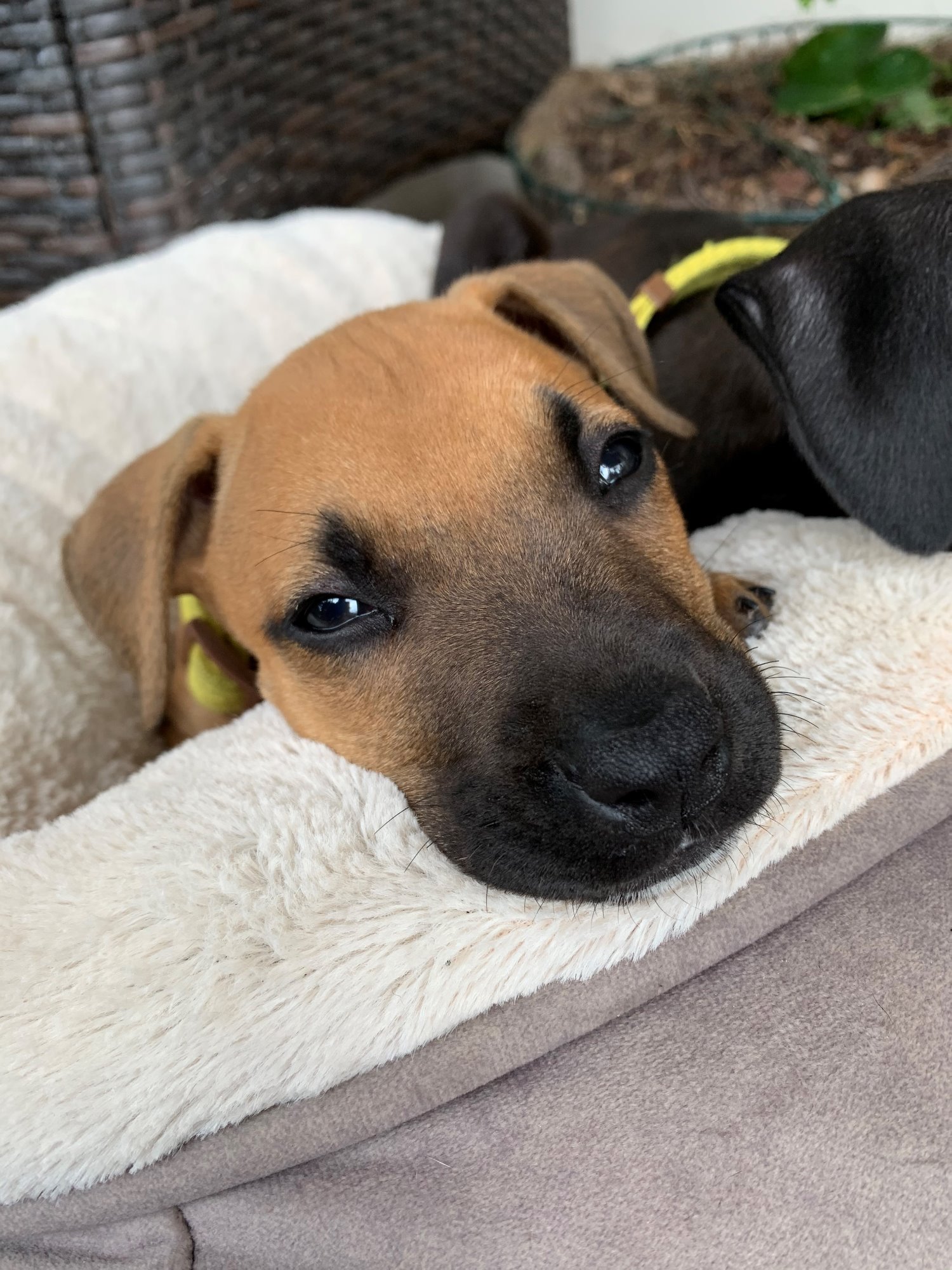 It is impossible to resist these eyes! Juno is a stunning 9 week old female Mastiff X who would cuddle and play with you all day. She is an active young lady whose favourite spot is wherever you are. She gets along well with her foster brother and sister but would be quite happy as an only dog if there was someone with her most of the time.