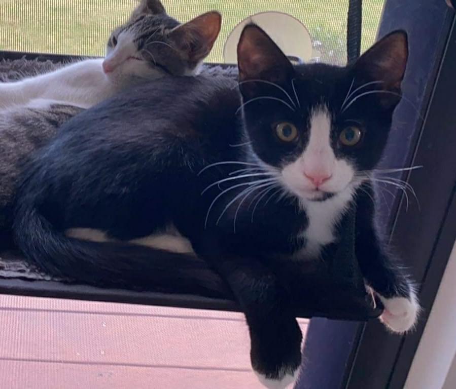 Scout is a black and white boy with long long whiskers. He has enormous eyes, and dainty white feet, and a little patch of white down the middle of his belly. Scout is usually one of the first to run out the door when we let the kittens out first thing. He runs straight to a human for a quick cuddle and purr, then lets us know that it is time to feed everyone. He is a real character, often lying in wait under a bed or couch for an unsuspecting foot or kitten to pass him by, before leaping out and starting to play.
