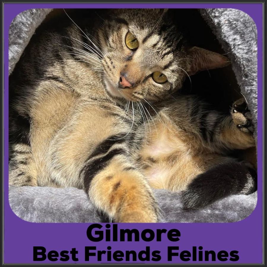 Gilmore loves his foster sister, and they will often be chasing each other through the house or throwing a toy in the air and chasing it. Gilmore gets along with most of the grumpy adult felines in the home and I will often find him snuggled up with one of them on a chair snoozing the day away.