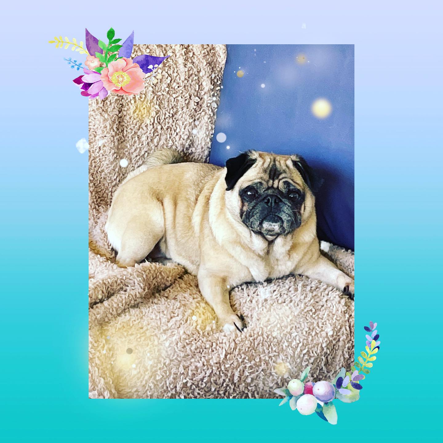 She is a sassy, spirited pug who likes to sit at your feet and will climb into your lap for a cuddle when given the chance. While in foster care she has been living with other pugs and older children, but as she has displayed some resource guarding around food, she will need to be rehomed with older children or teens who will respect her space..