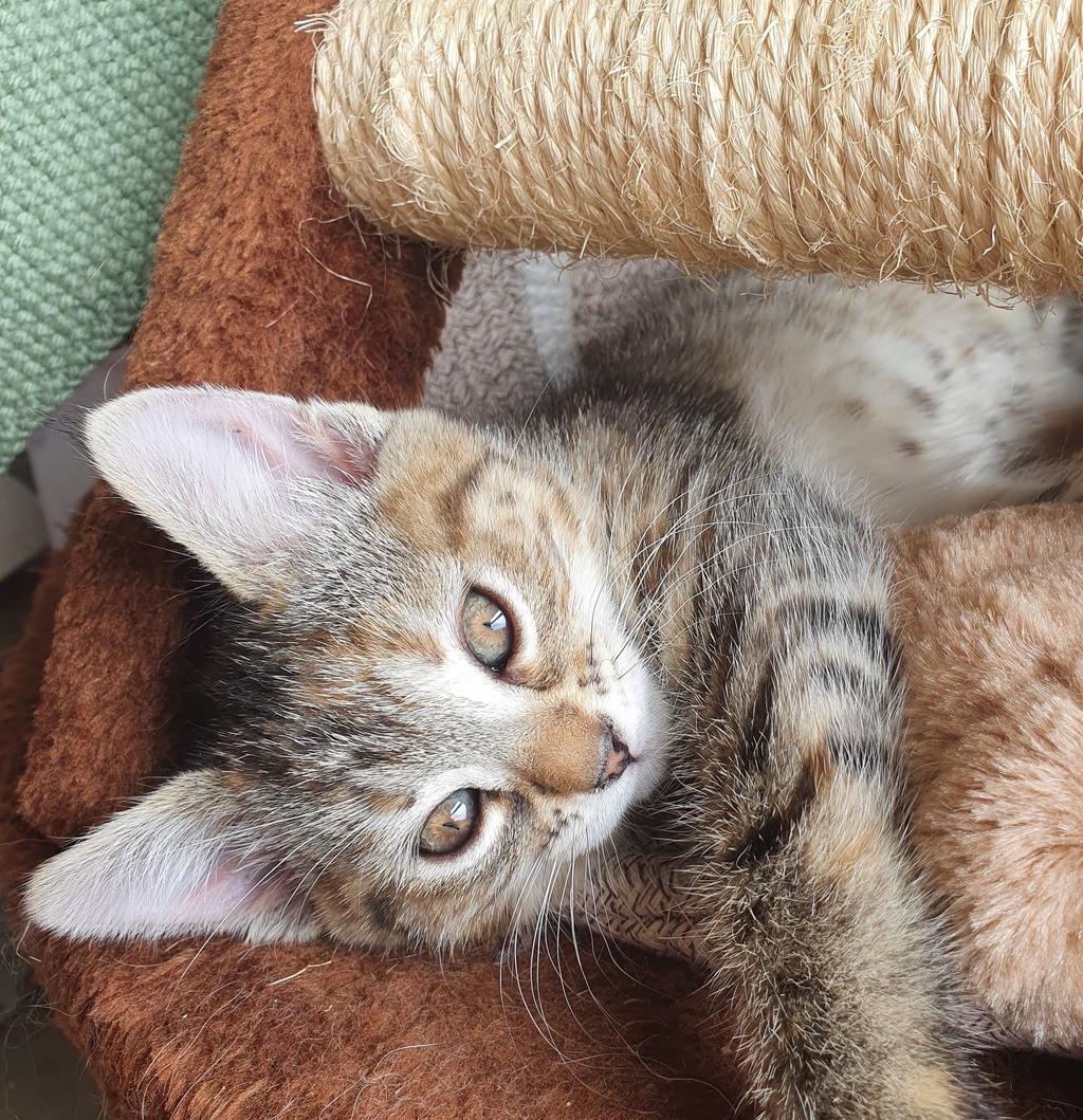 She's an affectionate and loving kitten who loves her indoor life. She purrs instantly when touched and loves to snuggle with her siblings or humans.