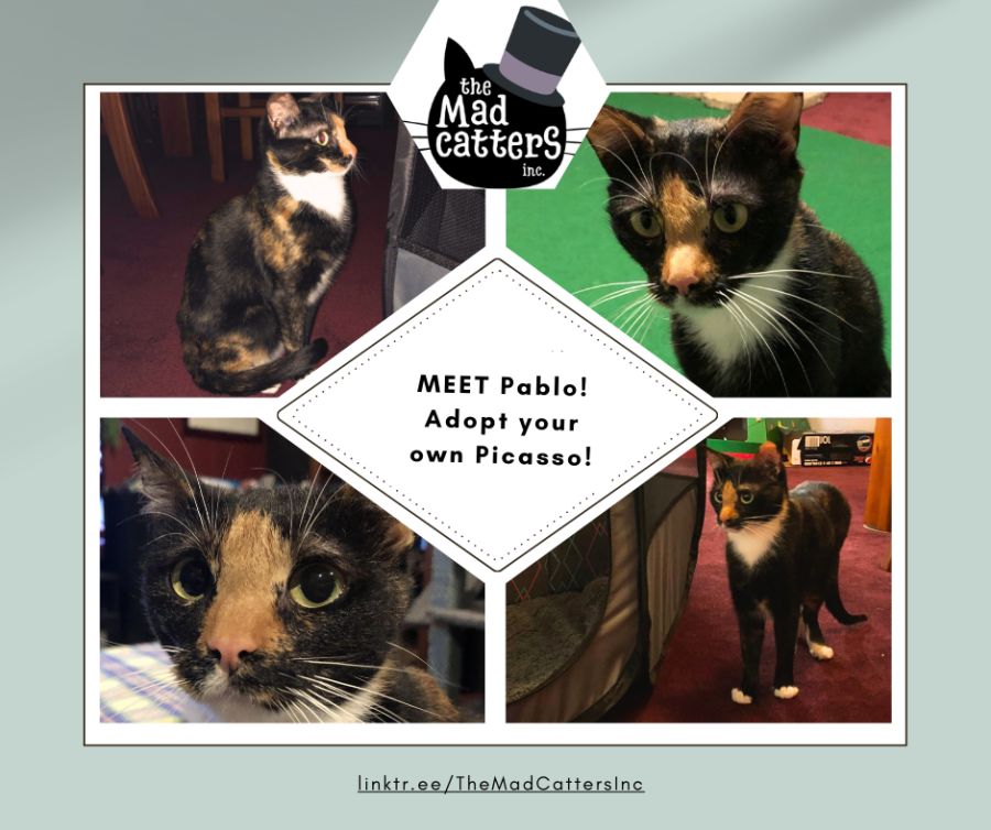 Pablo is a beautiful 3-year-old feline with a sleek tortoiseshell coat that is just like having your own Picasso! Her presence is simply enchanting! Pablo may be shy at first, but beneath her initial hesitancy lies a loving heart waiting to be discovered.