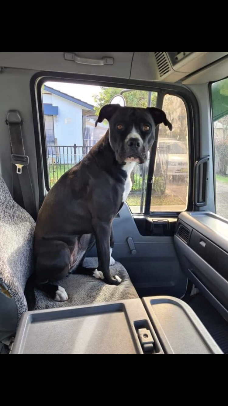 Koda. 3 yrs old. Female, Bullmastiff (French x English). Desexed, microchipped. Council registered. Black with white markings.