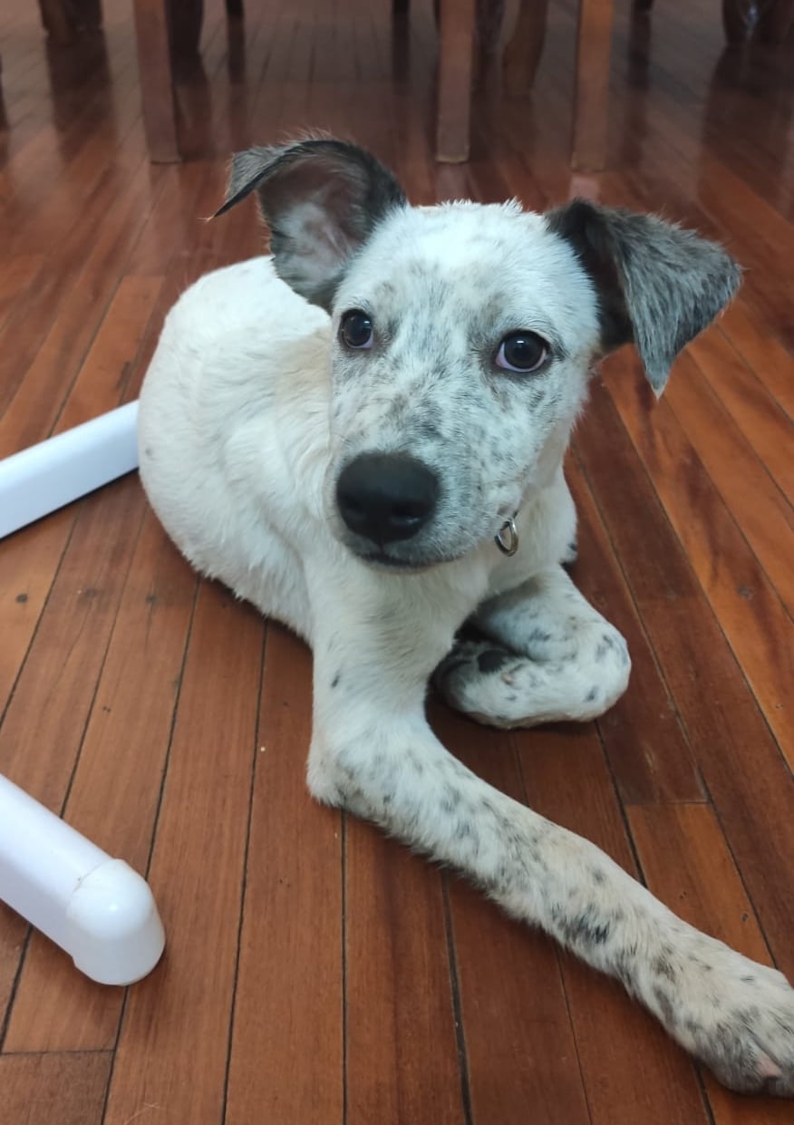 Nike who is predominantly white with the most unusual shade of grey colouring his ears and speckling his muzzle and legs. Nike is a clever cookie who enjoys company and plays hard.