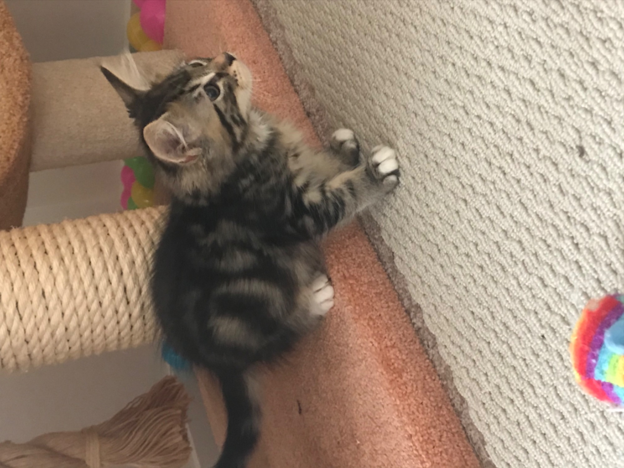 Nelson loves doing zoomies down the hallway and climbing up and down his cat tree. He’ll often sleep right up the top.