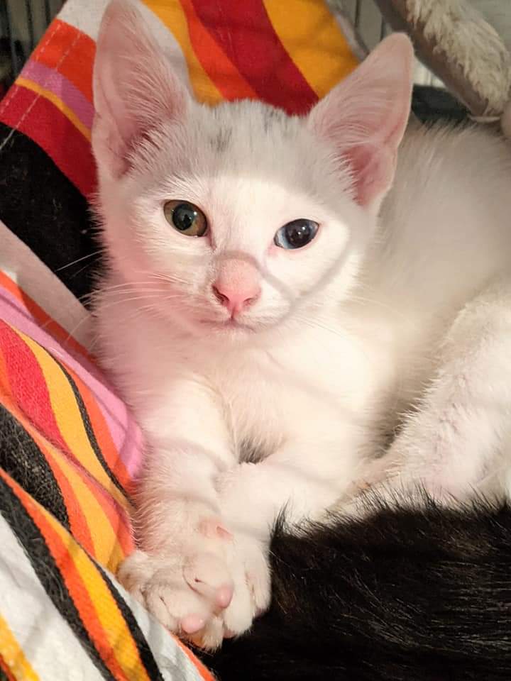 Breed: Domestic Short Hair White (small black marks on head and different coloured eyes)