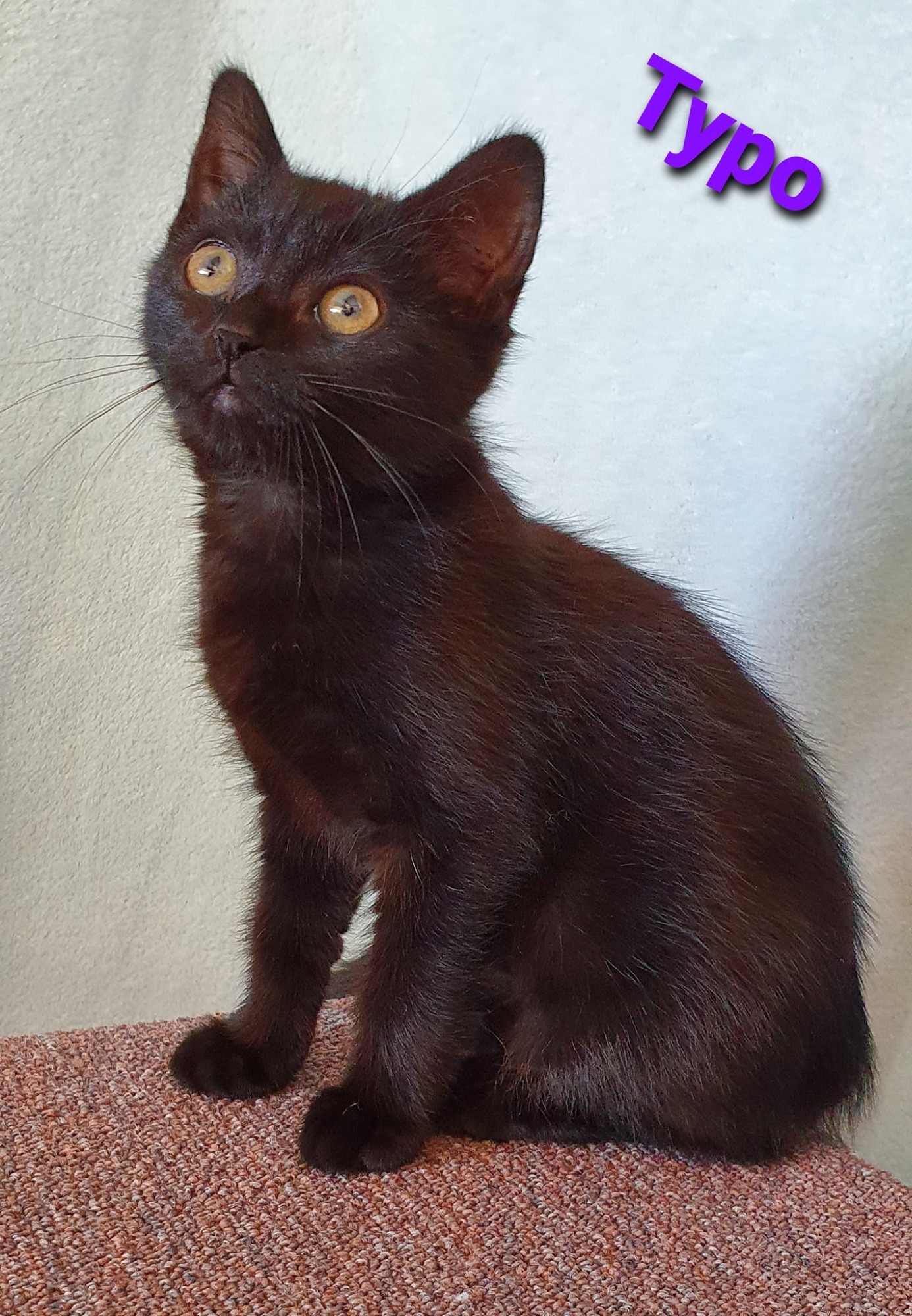 Typo has had exposure to other kittens and a dog. She is a gentle player so suit a family with older children. Typo has easily been integrated in with other kittens and cats and would be a good candidate for a home with an existing cat.