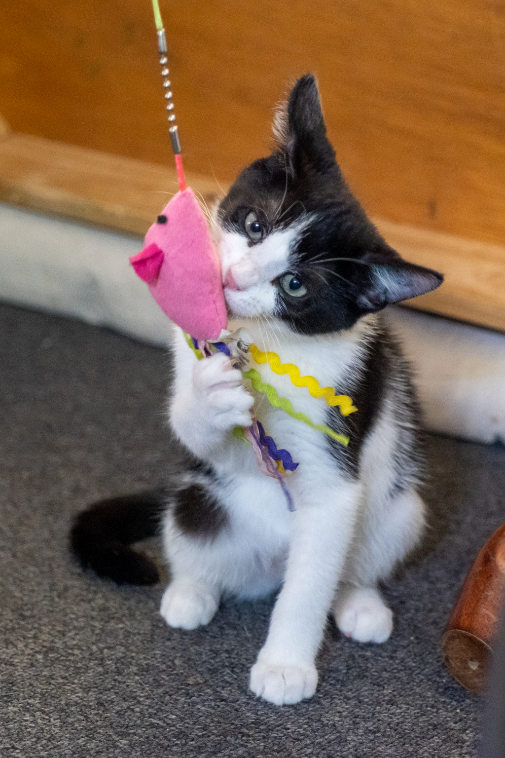 Lexie is an independent little girl who loves exploring. She is adventurous and loves to find new places to investigate and things to play with. When she's not playing with a random object she's found, she loves toys with bells or string toys, string toys with bells are even better! She also loves to play with other cats, she gets along fabulously with the cat in her foster home and would love to be adopted into a home with other cats.