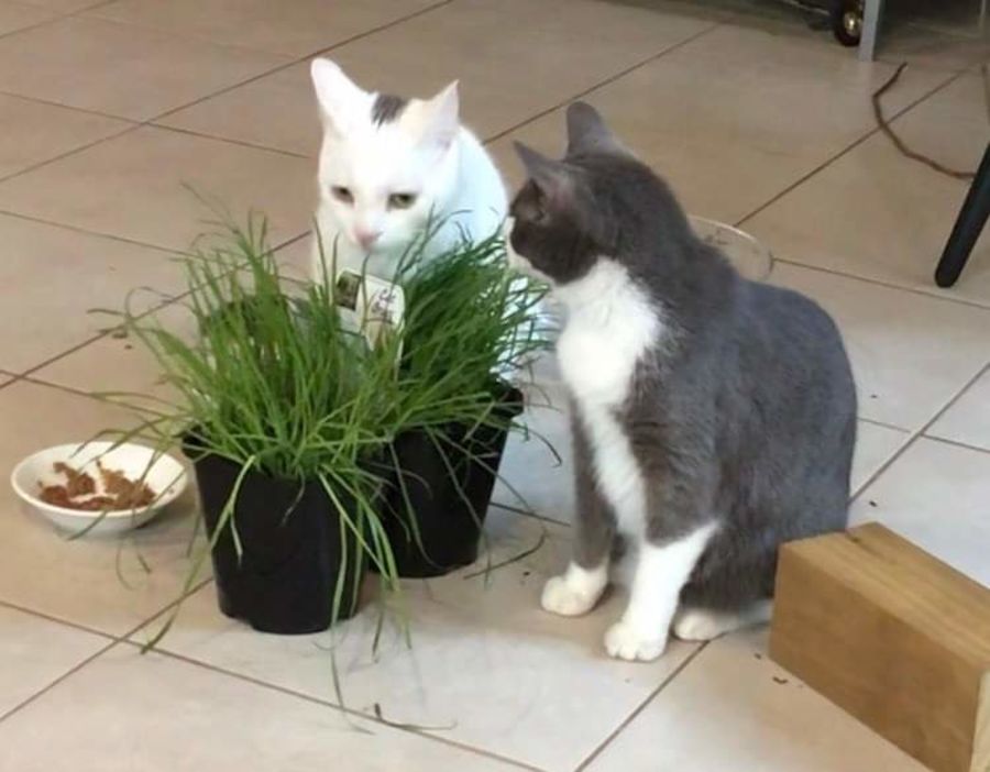 Despite not having much physical contact with people, Prissy (grey and white) loves to be around her humans and will show her contentment by bringing them toys (especially dangly ones) or rolling in front of them. She also has an adorable sound that she makes when she's happy or playing with her toys. Meanwhile, Trevor (mostly white) is more reserved at first but, once he warms up to you, will happily demand head scratches and purr loudly as a sign of his affection.