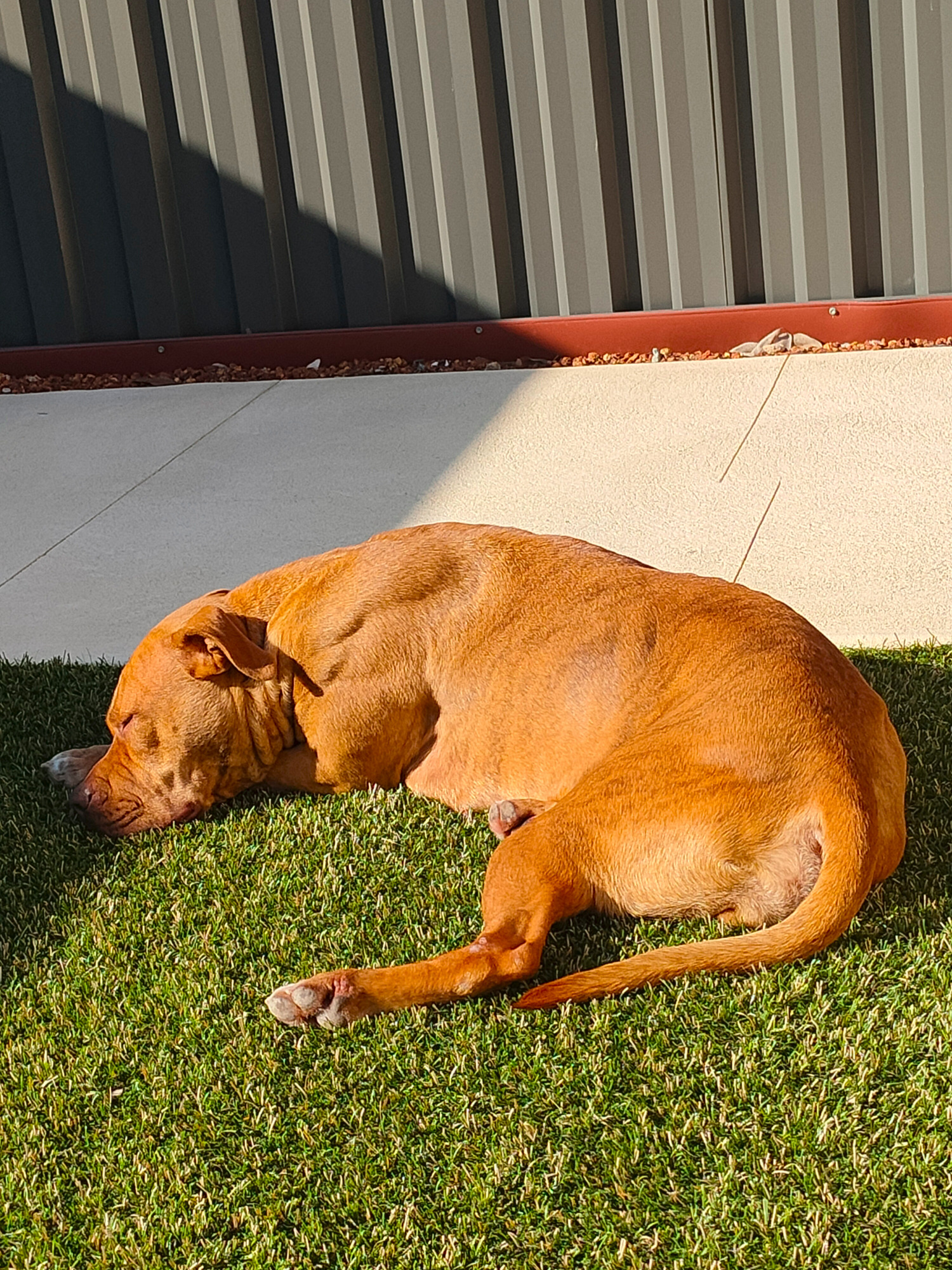 Marley loves her pats and belly rubs. She is quite happy snoozing away next to her humans. She is house trained and will sleep indoors through the night until you let her out to toilet.