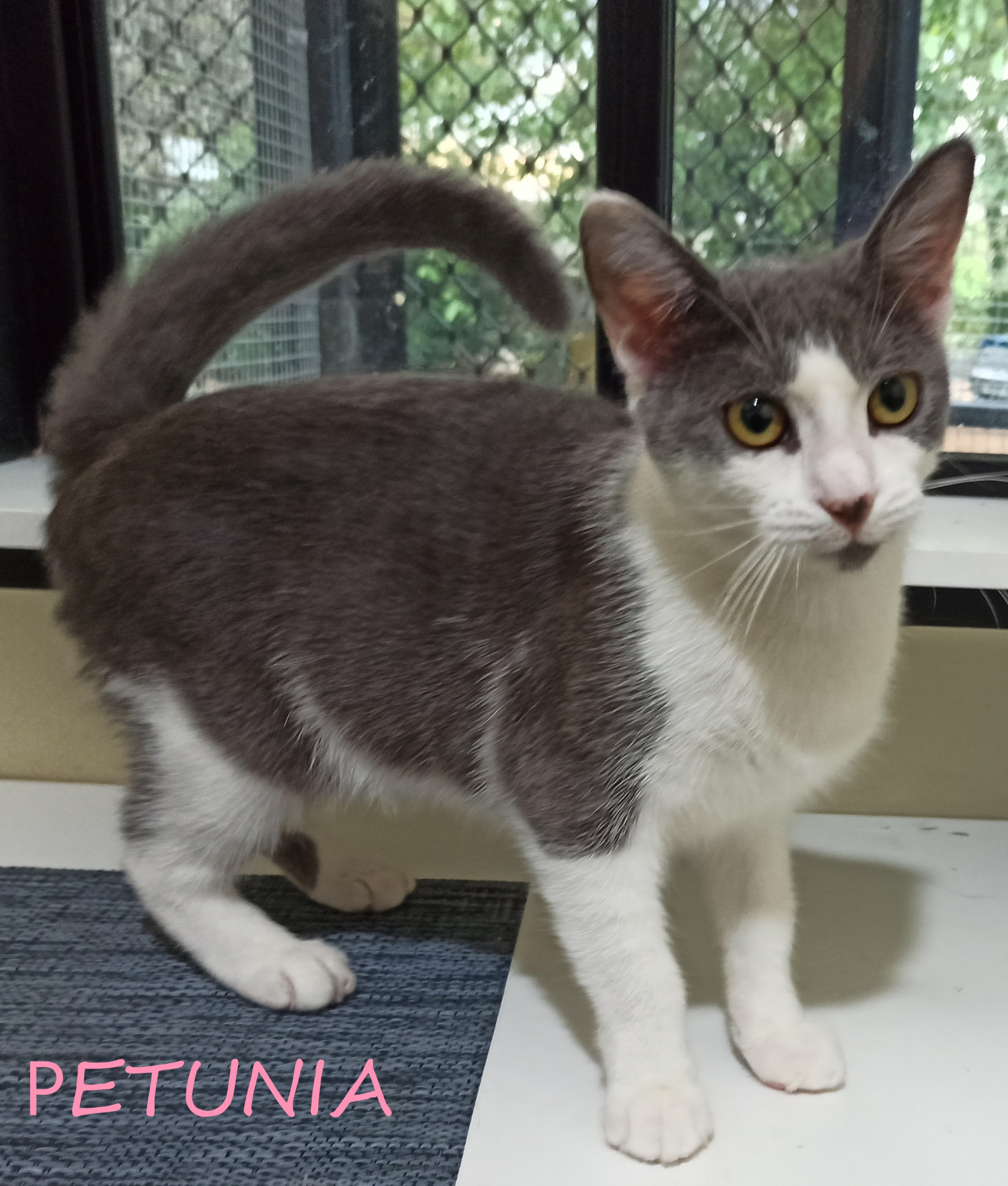 Petunia is a very pretty little lady cat she is a beautiful blue and white colour. She is a little shy when meeting people for the first time and will need a quieter house. She does not give her love easily and her trust will need to be earned, but when you hear her purrs you know that you are special to her. Once she realises the person entering will cause her no harm she LOVES a pat. Something has given this sweet girl a dreadful fear of people which she is working hard at overcoming. Her adopter will need to have a lot of patience and understanding for Petunia to build a trusting relationship where she feels comfortable. Petunia does not like being picked up for long.