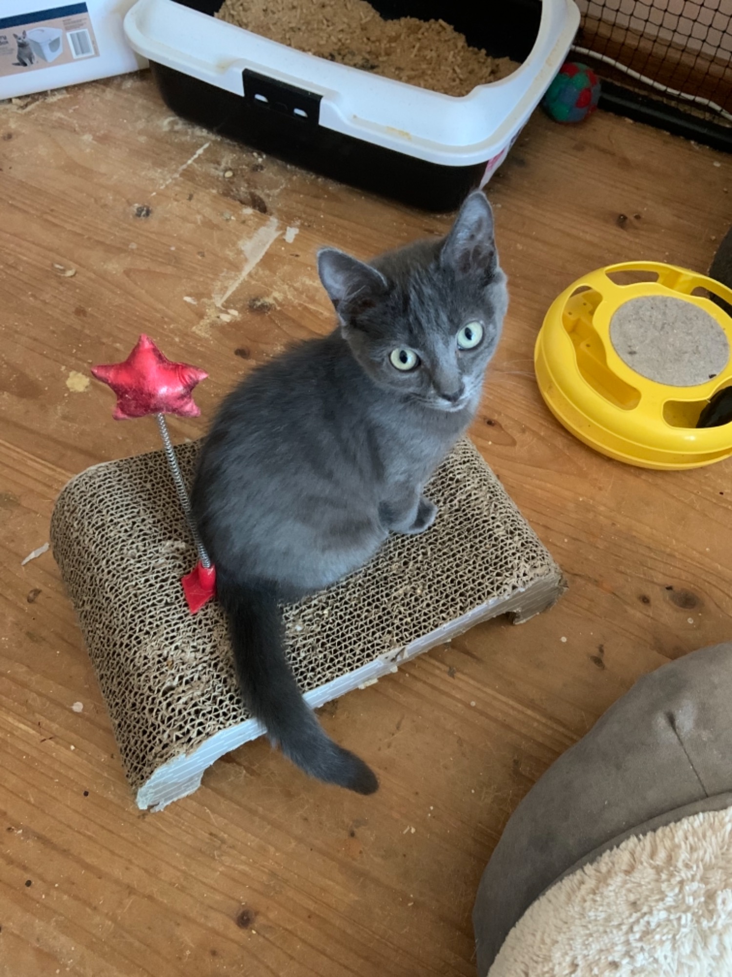 He loves a pat and is still learning to enjoy a cuddle and seems quite happy to be held. He’s fully litter trained and eats well.
