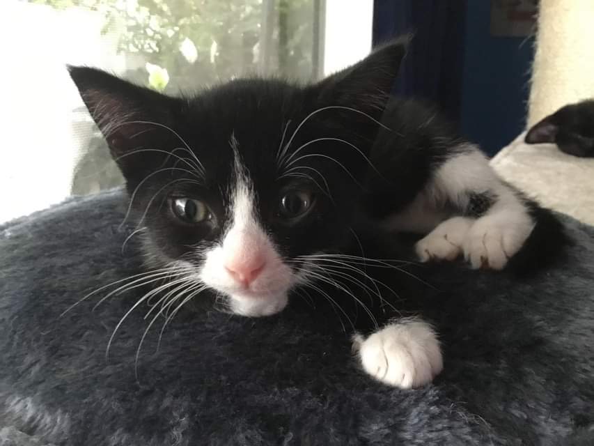 Lovely tuxedo kitten, one of a litter of 7 abandoned.