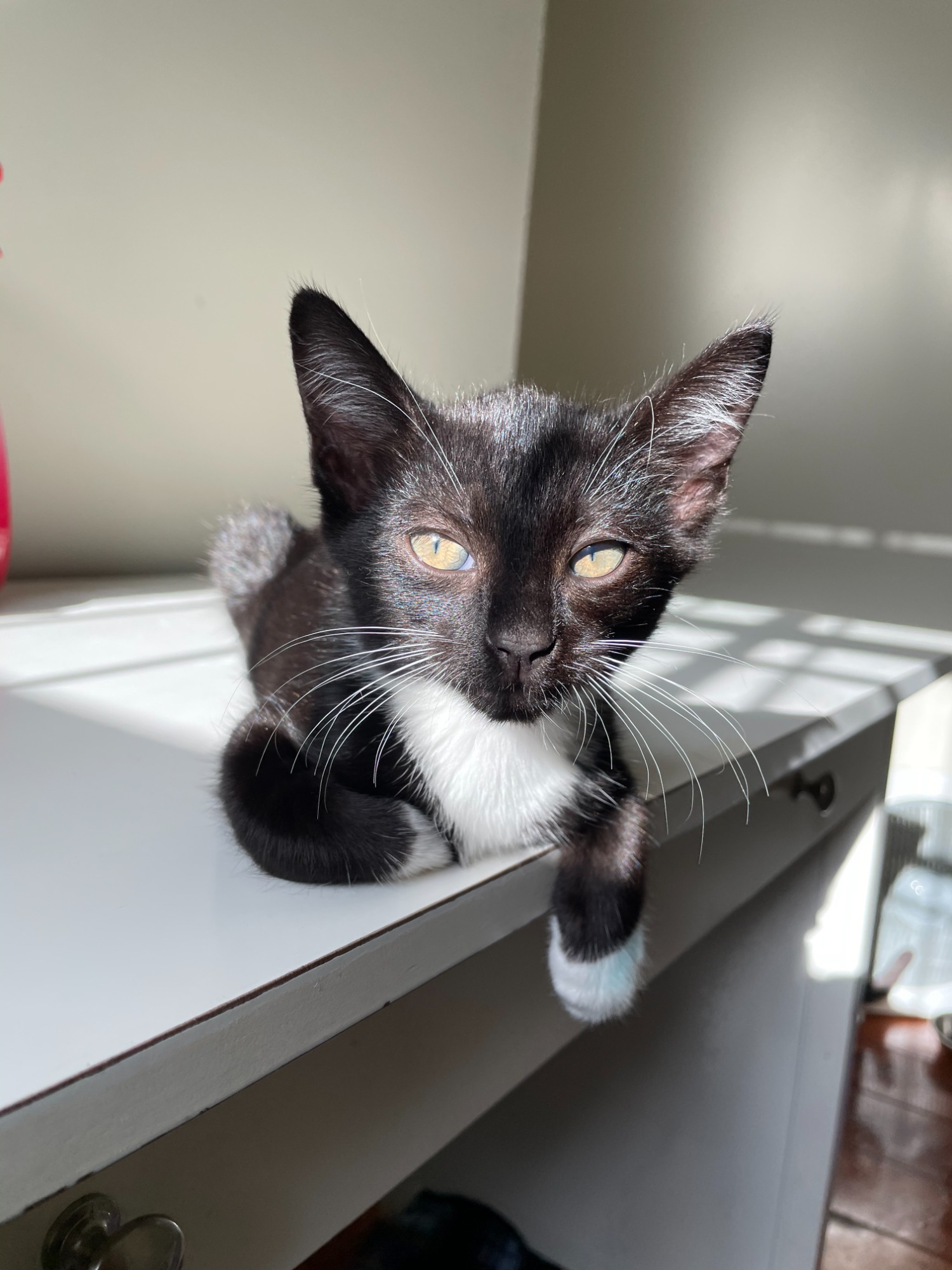 Pickles is the acrobat. Her favourite toy is the wand, which she’ll grab onto and go swinging on up in the air. Pickles has spunk.