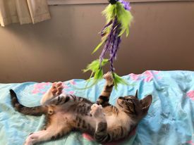 Sho is an adventurous energetic kitten who loves to play. He’ll be your own mini Tiger cub. He’s a tabby kitten with 4 white socks and long paws. He loves playing with cat toys, paper bags, boxes and ping pong balls. He also loves smooches, cuddles and affection. He is currently in foster care in Carina. He loves the company of his 2 sisters and a resident adult cat.
