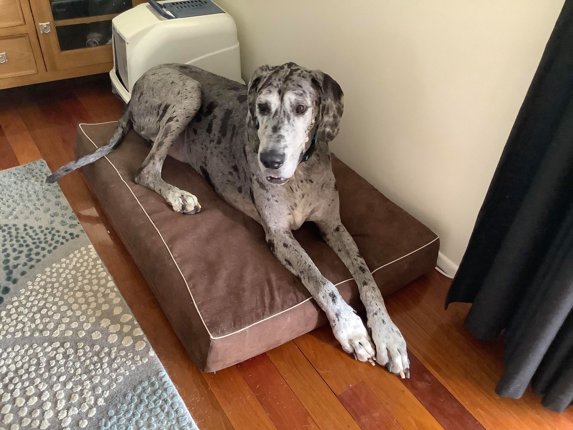 My ideal home would be with another mellow dog, some humans that give great pats and don't even mind those creatures they call 'cats'. As long as I have a comfy spot to sleep, that's all I need! As per usual, being a giant breed I require 5 foot minimum fencing to keep me safe.
