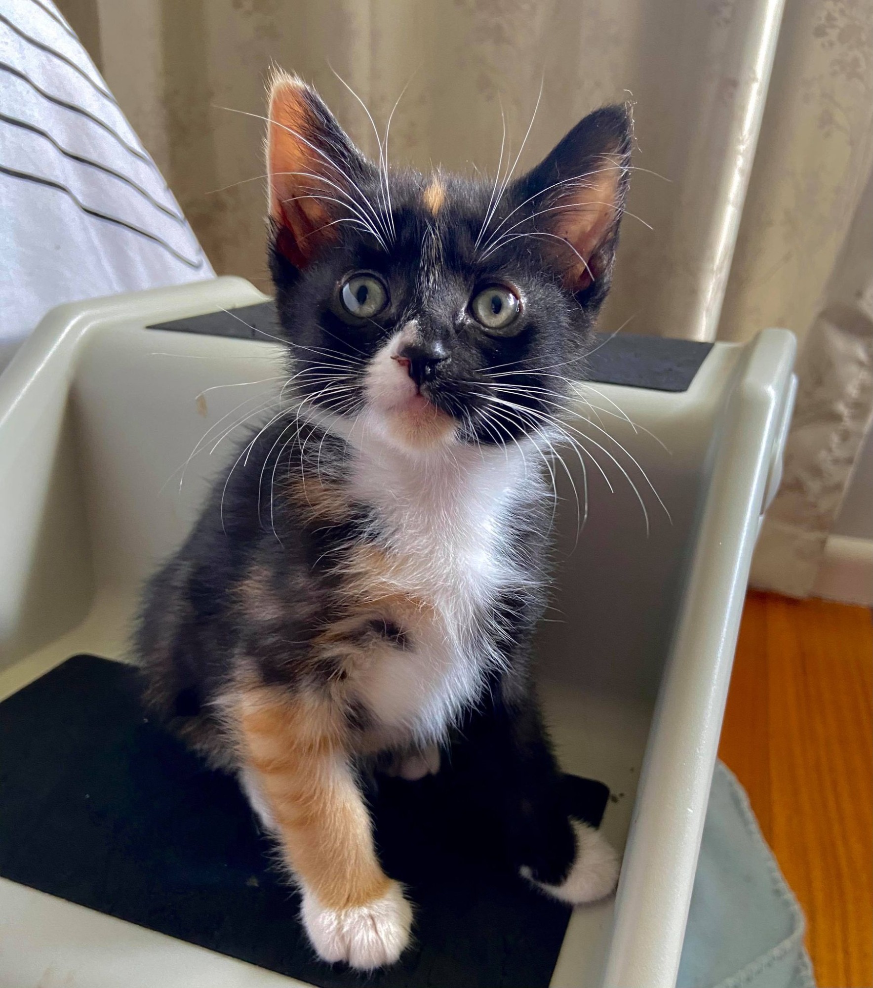 Sage is a very social kitten who majority of the time is off on adventures with her siblings as she has a high amount of energy and spends hours playing. Due to her social nature, Sage will need a feline sibling to be home with her when her humans aren't. She has been exposed to children and wasn't really bothered nor interested so a home with gentle children would be suitable.