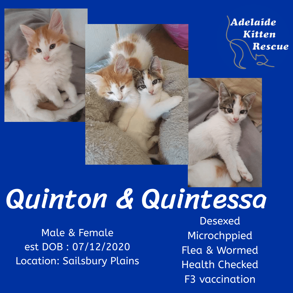 To meet Quinton & Quintessa PM us, email us at adelaidekittenrescue@gmail.com, or call 0434 131 997.