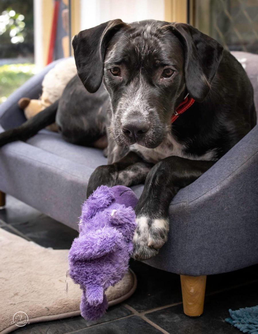 Hi my name is Sammi! It's my birthday soon and my foster mother said she’s going to organise a birthday party filled with my favourite squishy toys, a new tug rope and a big stick - even though I don’t chase them I love collecting them.