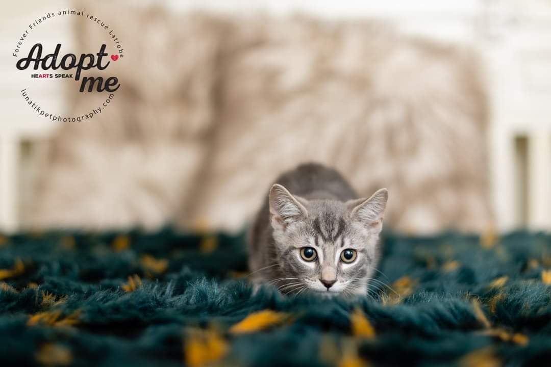 Looking suave and sophisticated in his grey striped coat, Harley is a gorgeous boy. A purring machine who enjoys pats and cuddles, he also loves wrestling with his big foster brother and three litter siblings.