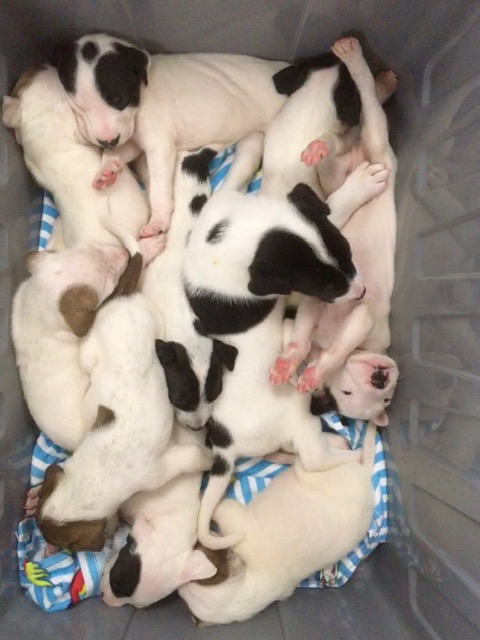 As a result, the pups were taken to one of our special carers who has looked after them wonderfully for the three weeks since. (Thanks Sharon!) The pups are gorgeous little bundles of love and cheek and are likely to have their mum's delightful temperament. She is a Bull Arab X so is smaller than a pure breed but she is friendly and affectionate. All of her pups are white with either black or chocolate markings and are getting healthier and more playful by the day.