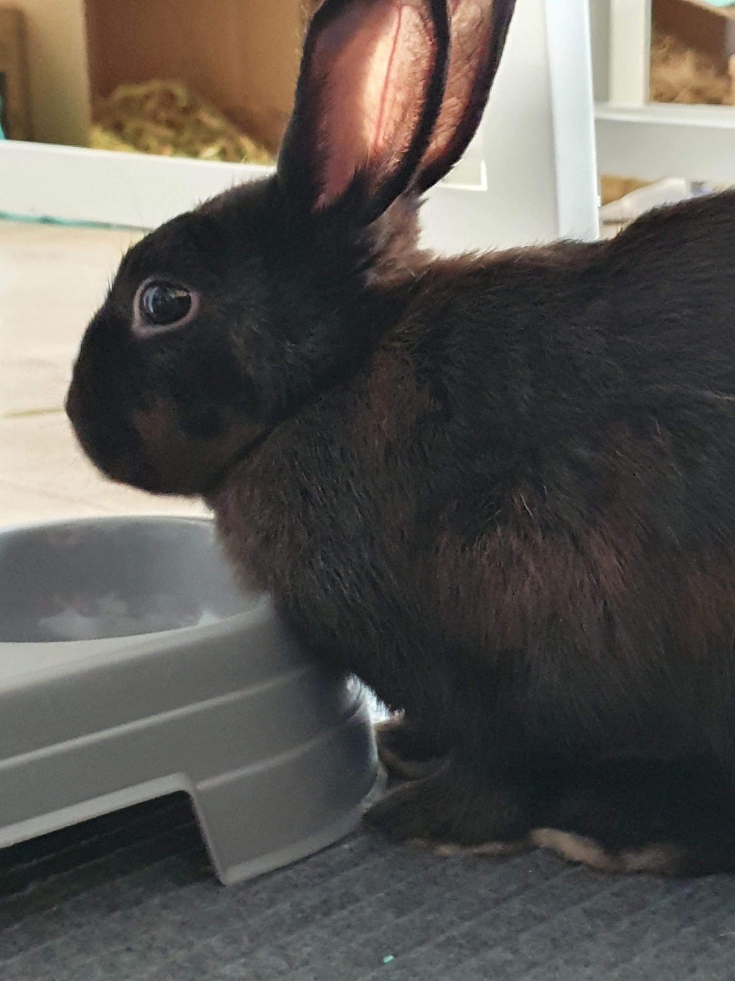 I loooove food! Banana and cos are my favorites. Maybe you could gain some of my trust by bribing me with them, hehe. My foster mum says I'm a beautiful, happy, playful bunny. I'm curious and love to explore. I like redecoration my space, climbing and stretching up to nosy at what's going on.