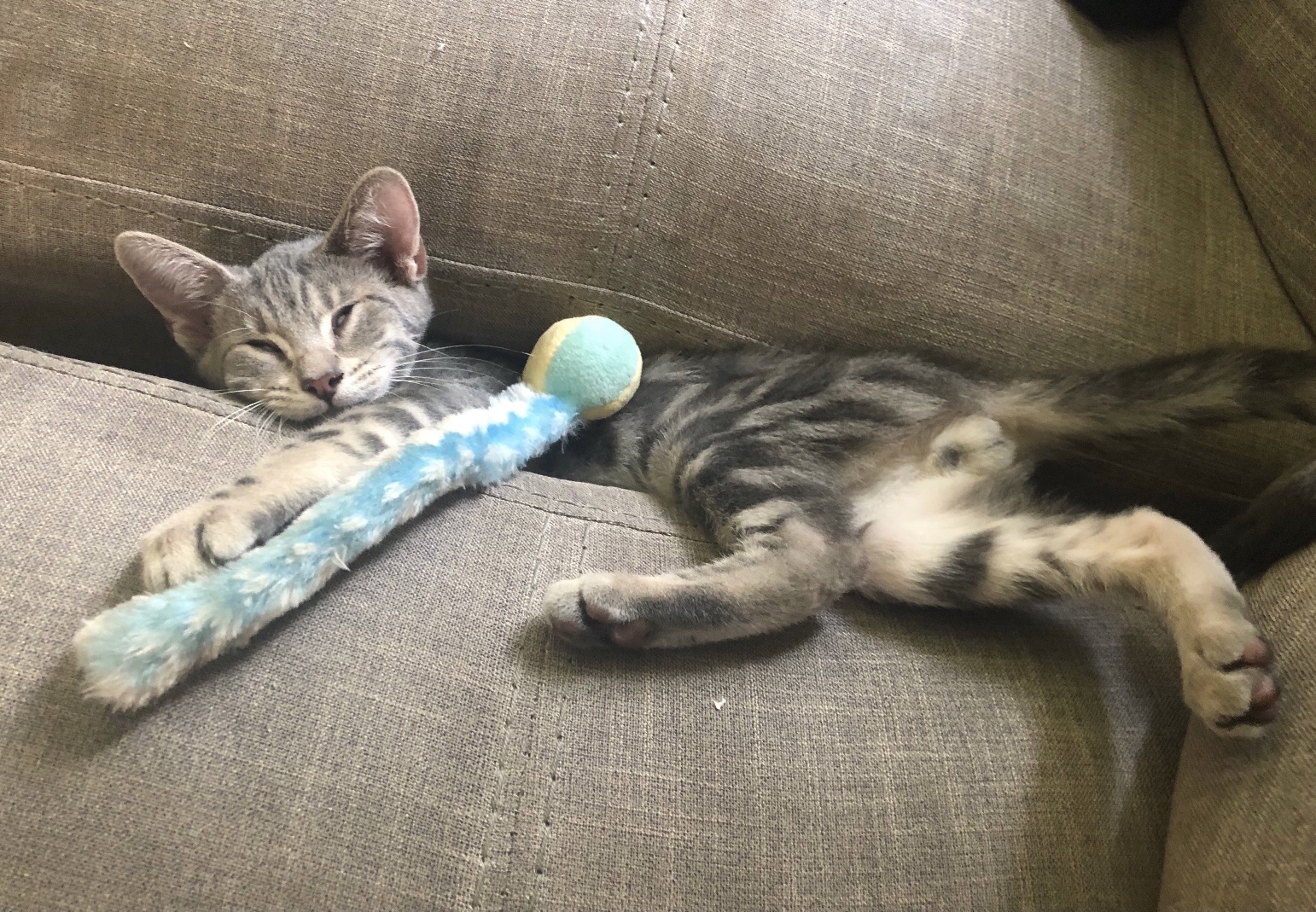 An adventurous little kitten who loves playing with the noisiest toys that he can find. Asten is known to be the playful one out of his family and loves to have a rumble with the rest of his siblings. Always ready to play!