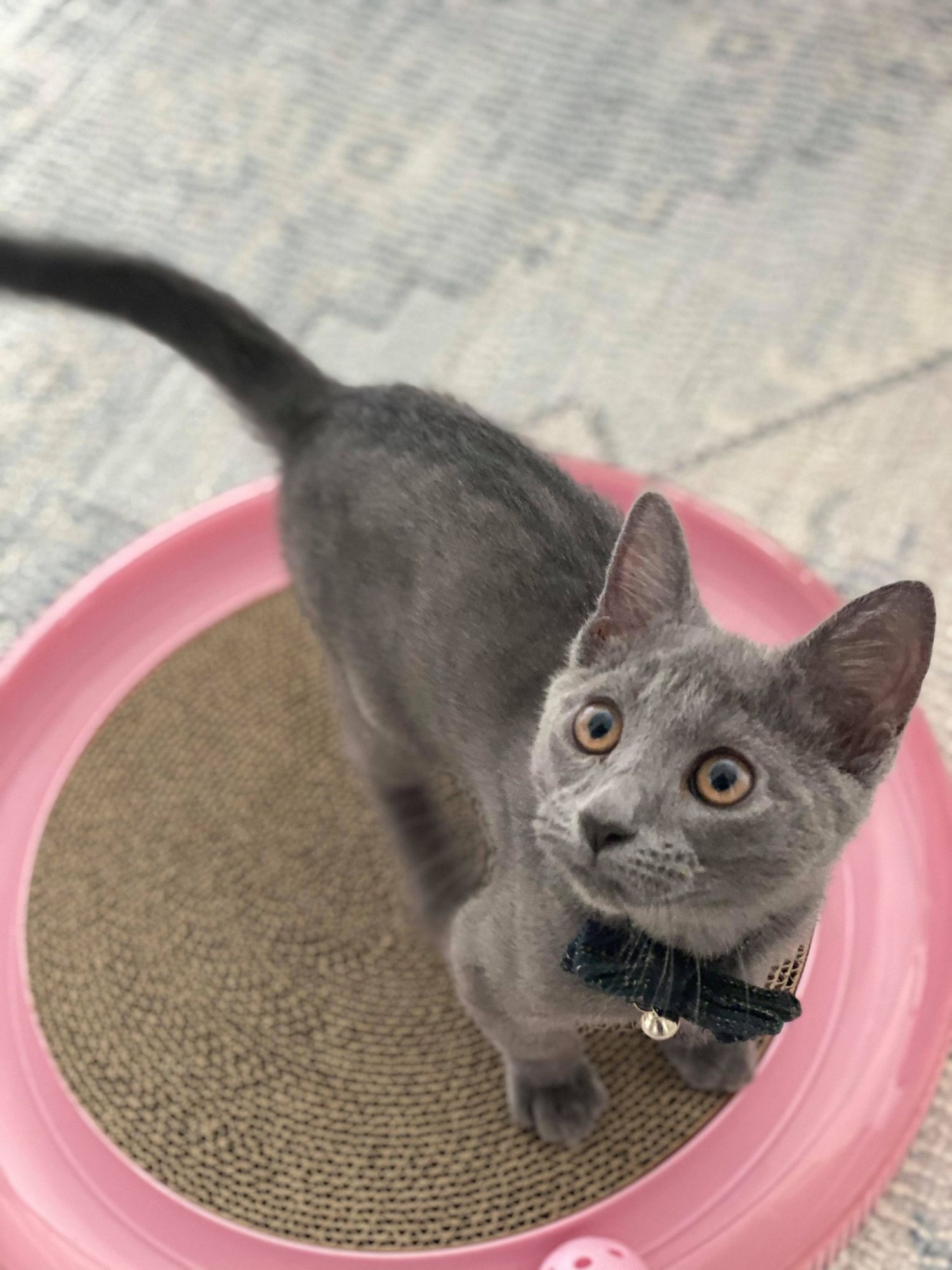 Comet is also super playful, and if he’s not sleeping you’ll find him chasing his toys or climbing to the top of his cat tower with his favourite ribbon 😂 he will bring that same ribbon to your feet to show you, then zoom off with it before you get the chance to touch it. His carers family call him a “time waster” because watching him play is more entertaining than TV 😂