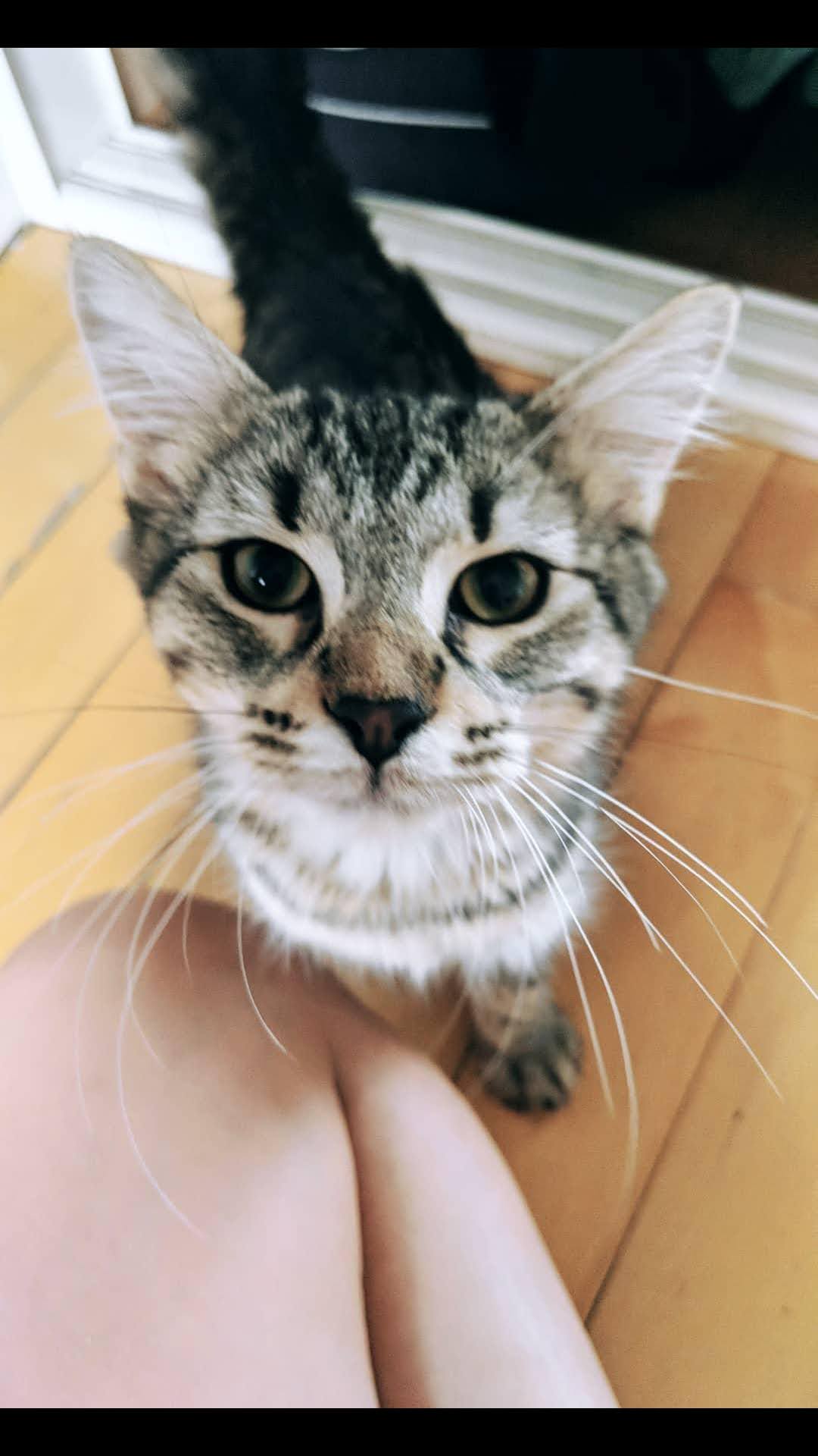 She and her 4 siblings came into foster care at 12 weeks old, having been feral up to this point. While her siblings would hiss and run away, Astrid has a freeze response and just ducks her head to hide.