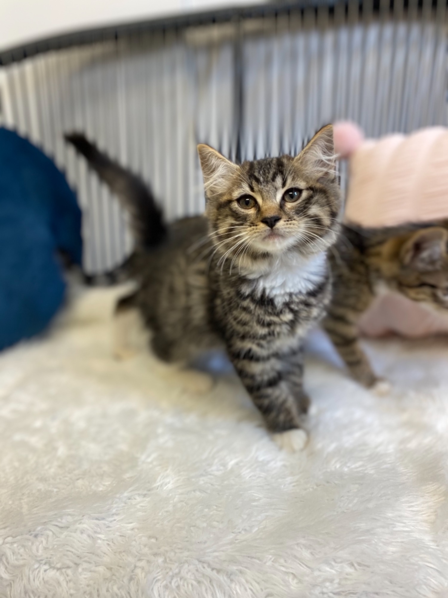Howie is a 9 week old Male Tabby & White Domestic Medium Hair Kitten. He is a super cute and playful little guy. Howie and his siblings got their names from the Big Bang Theory!