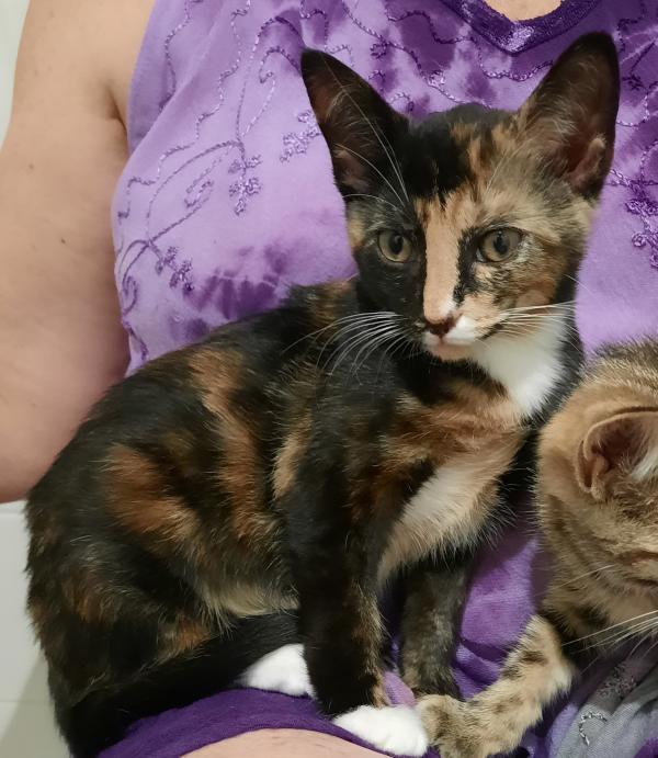 Coco is a tortoiseshell female with white socks female who came into care with her 4 siblings. Coco was initially fearful of humans, however after much love & pats, she now purrs loudly and will sit on your lap while you pat her.