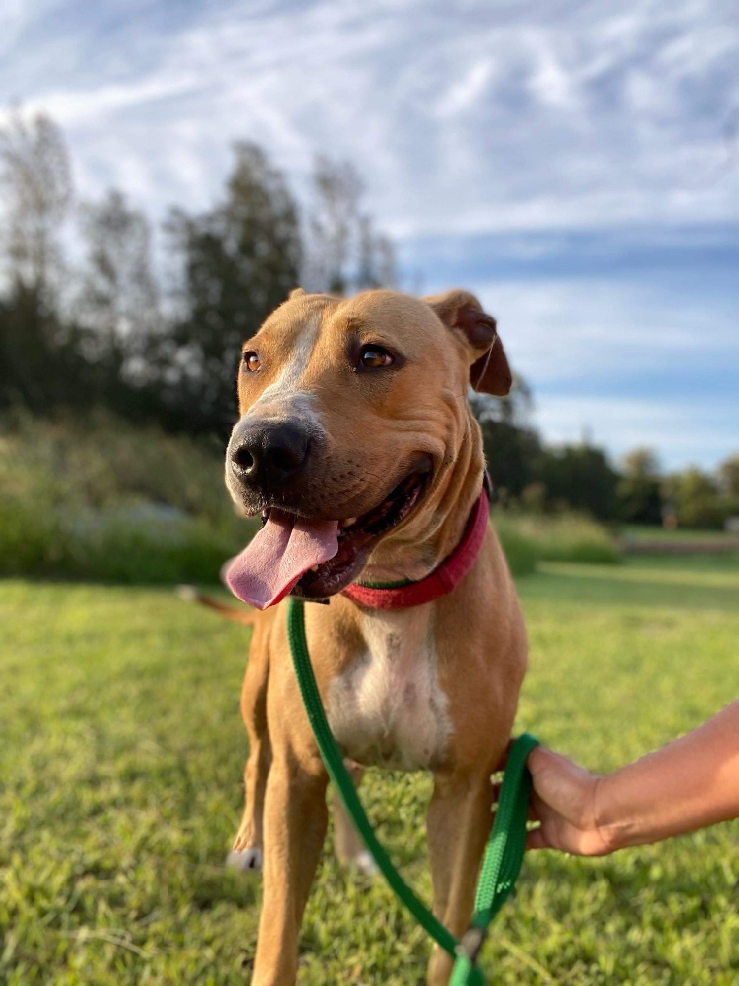 She walks quite well on the lead, but her main issue is that she can jump a 6 foot color bond fence. So will require 7 foot fences, or she would suit apartment living with an active family. She has met children, and greets everyone in a loving manner.