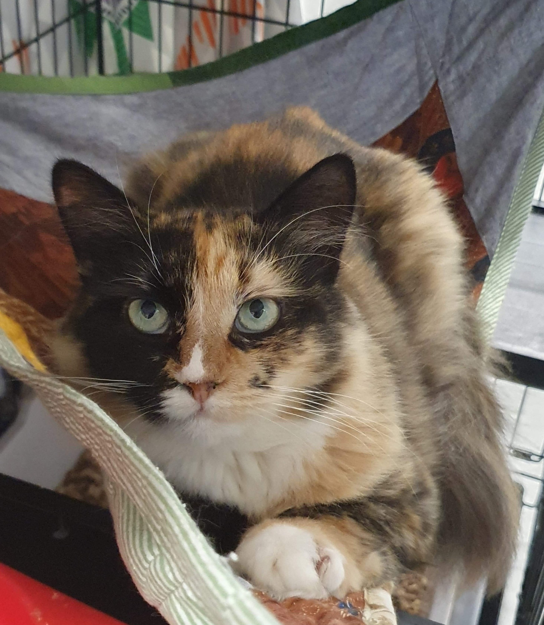 Mia is Bella's mum & they were brought to SAFE by a good samaritan who found them living together on the street - Bella was just a small kitten at that time. Mia is a tortie with some white flashes and Bella is a dark tortie. We estimate that Mia is about one and a half and Bella is about 10 months old.