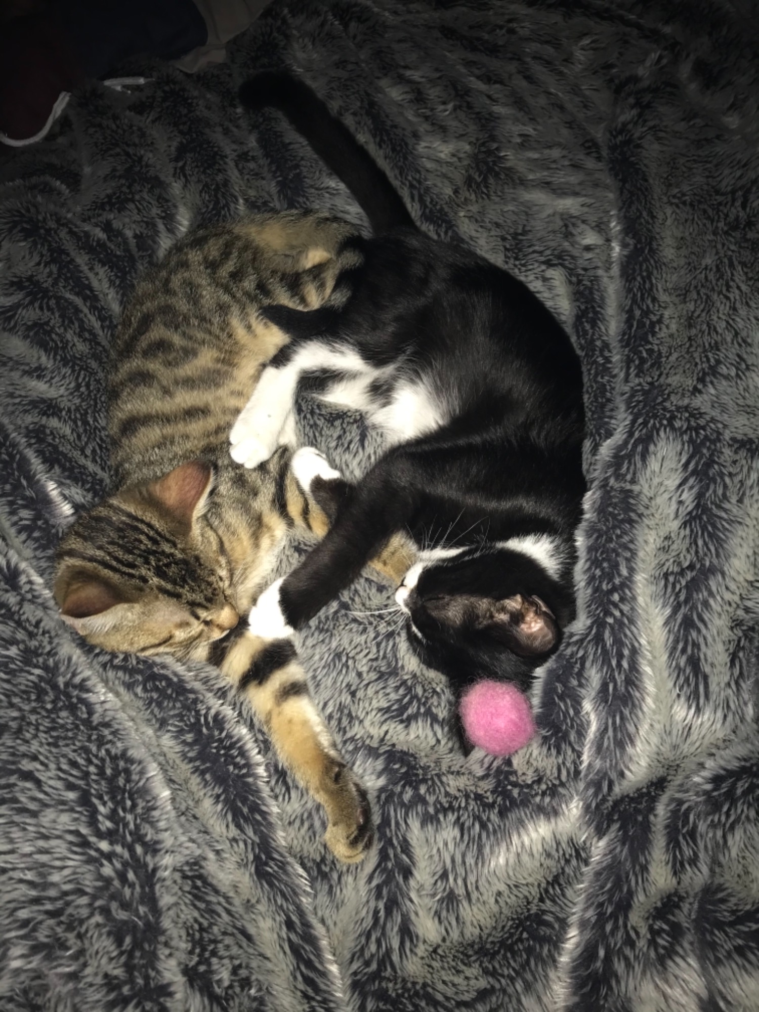 Tora loves to sleep on his humans bed or close to a window to enjoy the sunshine whilst he naps, waking up occasionally to run around and play with his friends or toys, before finding a nice warm spot to nap again.