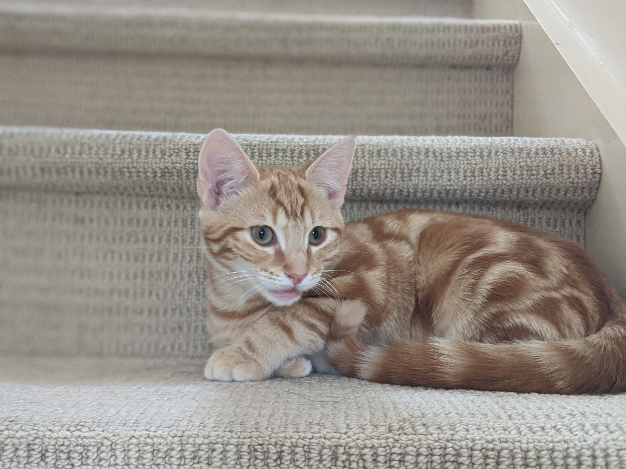 I'm Juno with the big red spot and ginger swirly patterns, I'm a little nervous but I ABSOLUTELY LOVE CUDDLES! And I'm a big PURRING MACHINE! I just need to warm up to you little, a very little because I really do love pats, then I'll be falling all over myself and drooling with love and happiness! 😻