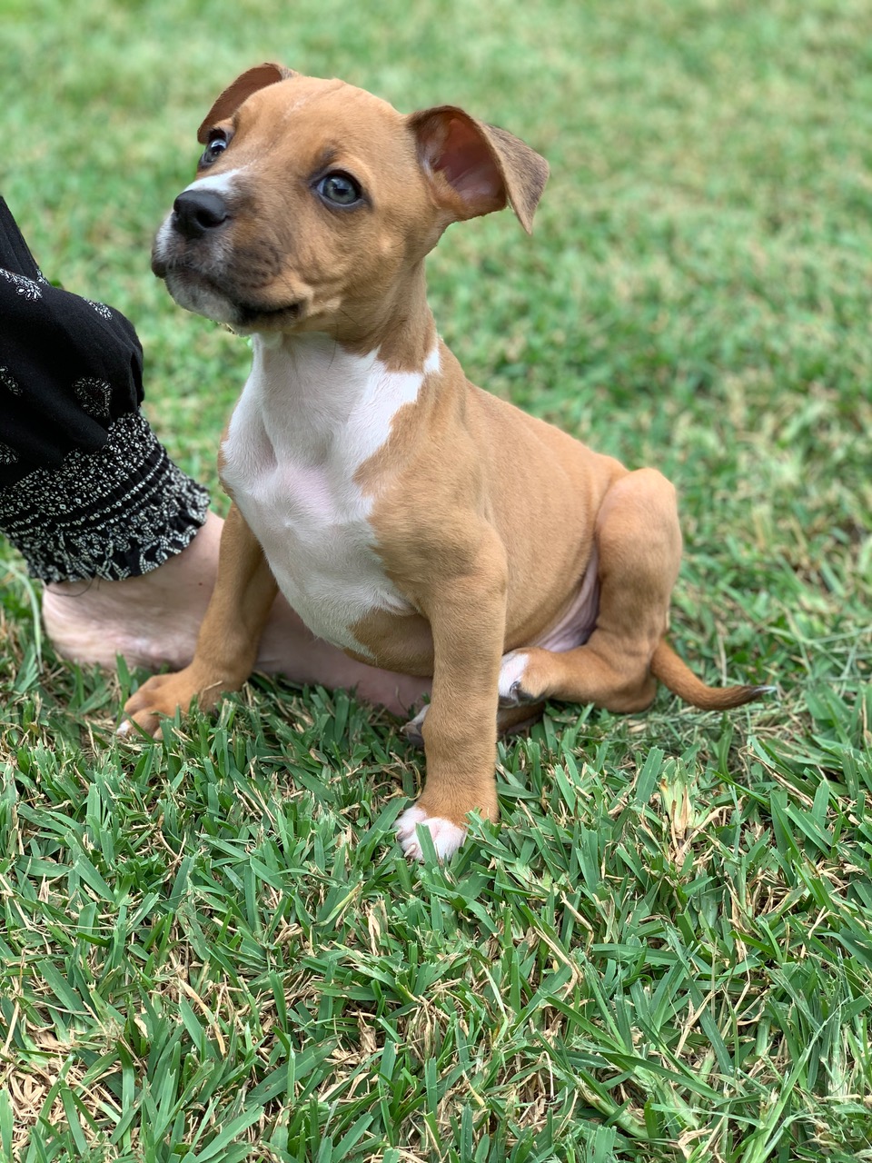 Dodge is a 10 week old boy staffy x pup who is now available for adoption. He gets on well with other dogs and is used to both inside and outside environments in which to run and play in so will need access to both. As he has been closely hand raised in a home environment, he may need someone home more often than not.