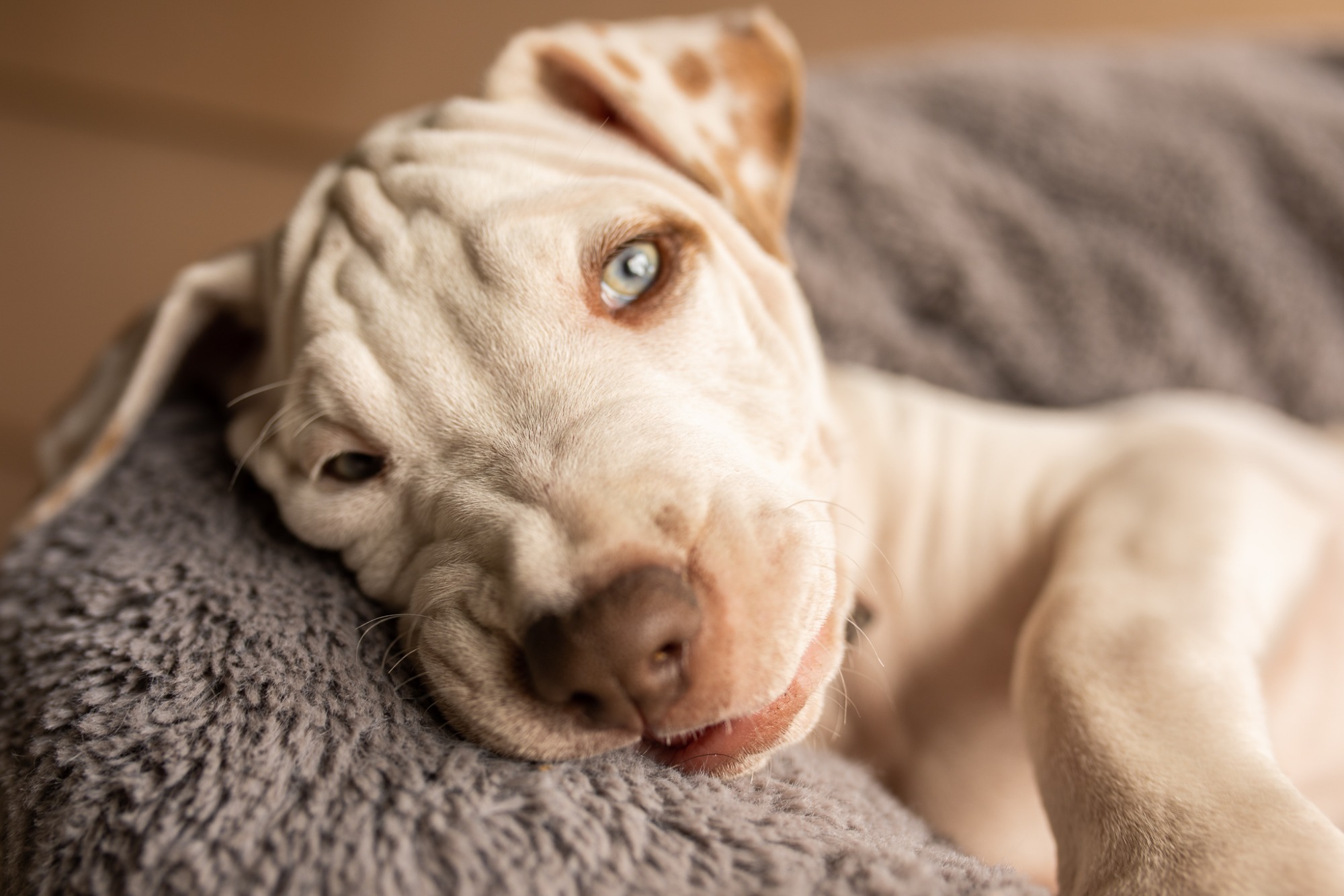 Alex loves human company and is very use to being inside. He will quite happily snuggle up on your lap, but also loves his outside environment so please no apartment or courtyard applications as he will be a medium to large dog so will need plenty of space.