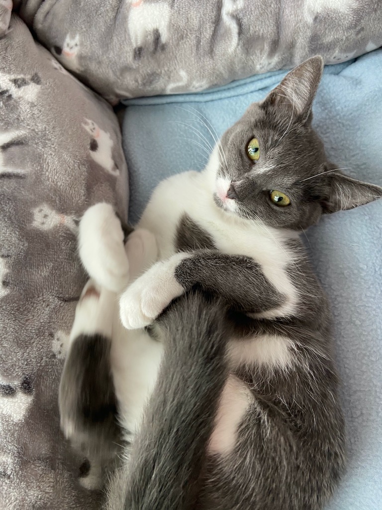 Sugar is a stunning grey and white short haired kitty. She is a gentle soul looking for a family of her own to fall in love with!