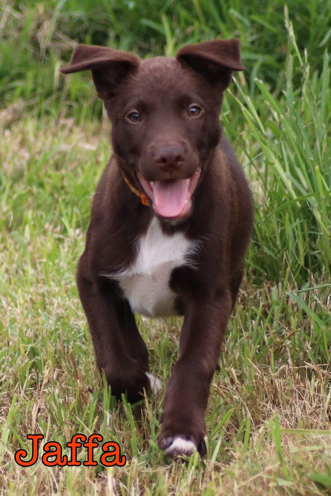 Jaffa adores other dogs but may be suitable as an only dog if his new owners didn't work full time. We can see a little bit of sweet mischief happening if not preoccupied a bit more.
