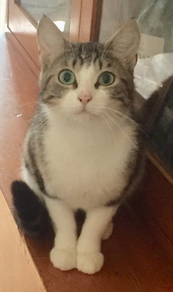 Kiki is a beautiful tabby and white cat with green eyes who needs a patient human. She's extremely shy but she'll spend the day waltzing around the place with her tail in the air looking gorgeous, laying on your bed (as long as you don't get on it) and playing with the other cats (she's very friendly with other cats). She's a very quiet cat and doesn't meow much, but that doesn't mean she won't talk to you when she comes out of her shell a bit more, at the moment she communicates by looking at you when she wants something. Kiki is super playful with toys, the scratching post and with her bestie in foster care, Buddy Boy. She's food motivated and has learned how to high five for food, it's so cute!