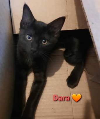 Dara (black) is a pure sweetheart. Her foster carer got her first cuddle today. Purrs a lot. Carries toys around in her mouth.