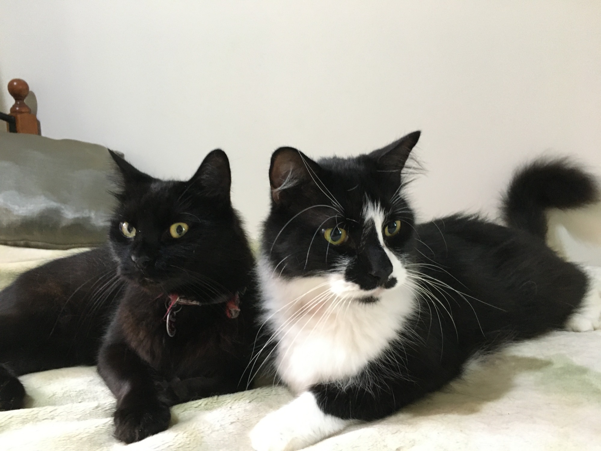 Bam Bam, the black and white boy and Maccona are liter mates who have been together all this time. They are super friendly, cuddly kitties who enjoy being together sharing laps, beds and time with their humans. They're very affectionate and will rub up against you smooching and purring, asking for as much attention as you can give them. They never tire of petting so they will fit in with anyone who wants a couple of lap cats who are also gorgeous to look at and wonderful company.
