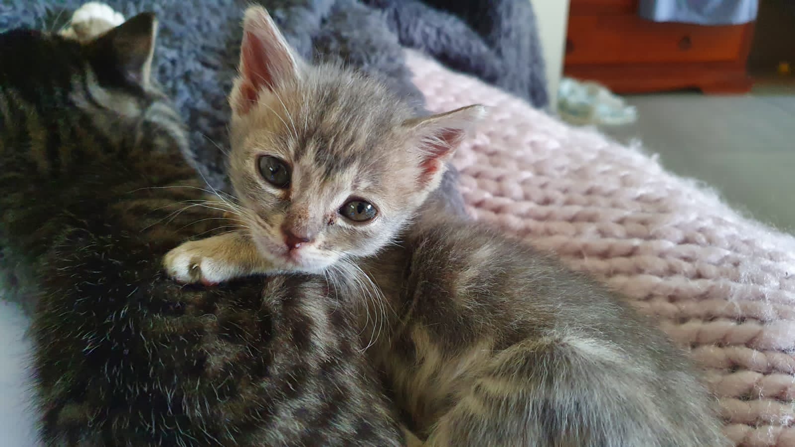 Mia is coming upon 7 weeks of age. She is a quiet little girl with a slow start to life, but that hasn't stopped her one bit! She loves to pounce on her siblings and meow at you for attention. She also enjoys lots of purrs when having cuddles with her foster human.