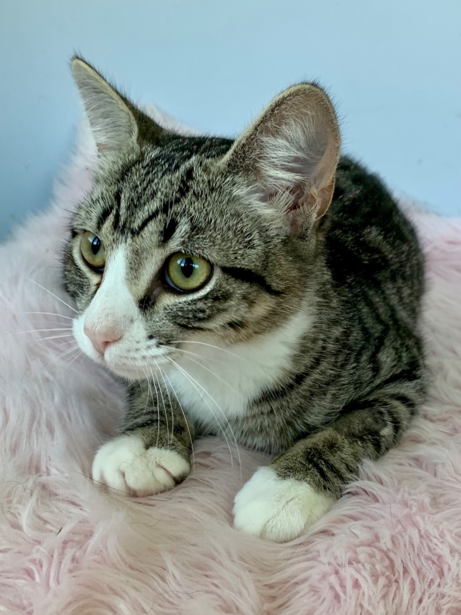Harriet is a shy girl when you first meet her but she loves the ones she trusts. Once she feels safe she is very cuddly and purry. She is great with other cats and has been around dogs and doesn’t mind them.