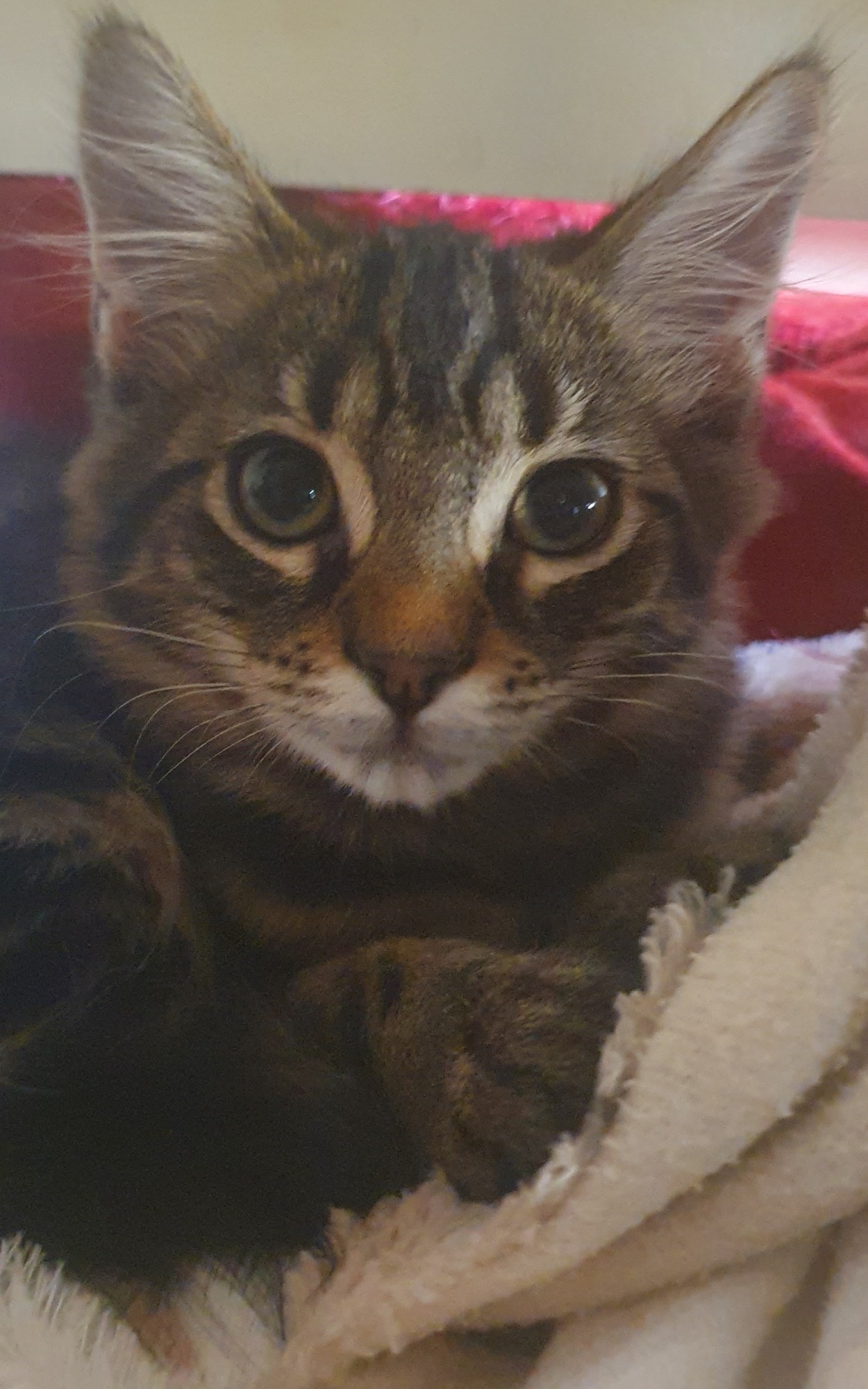 Squirt, so named because she was the smallest in her litter and the most quiet. Actually she got picked on a little bit by her siblings but has grown in confidence. In fact she is a combination of smoochbug and independence. She has a mind of her own and can keep herself occupied and also likes a patt and is an active girl. Not big on being picked up though at the moment. She likes to come visit when sitting at the computer and plop down on the desk, curl up in her fave spots and have a play with a toy when the fancy takes her. Squirt doesn't mind being brushed either and is fine with other felines.