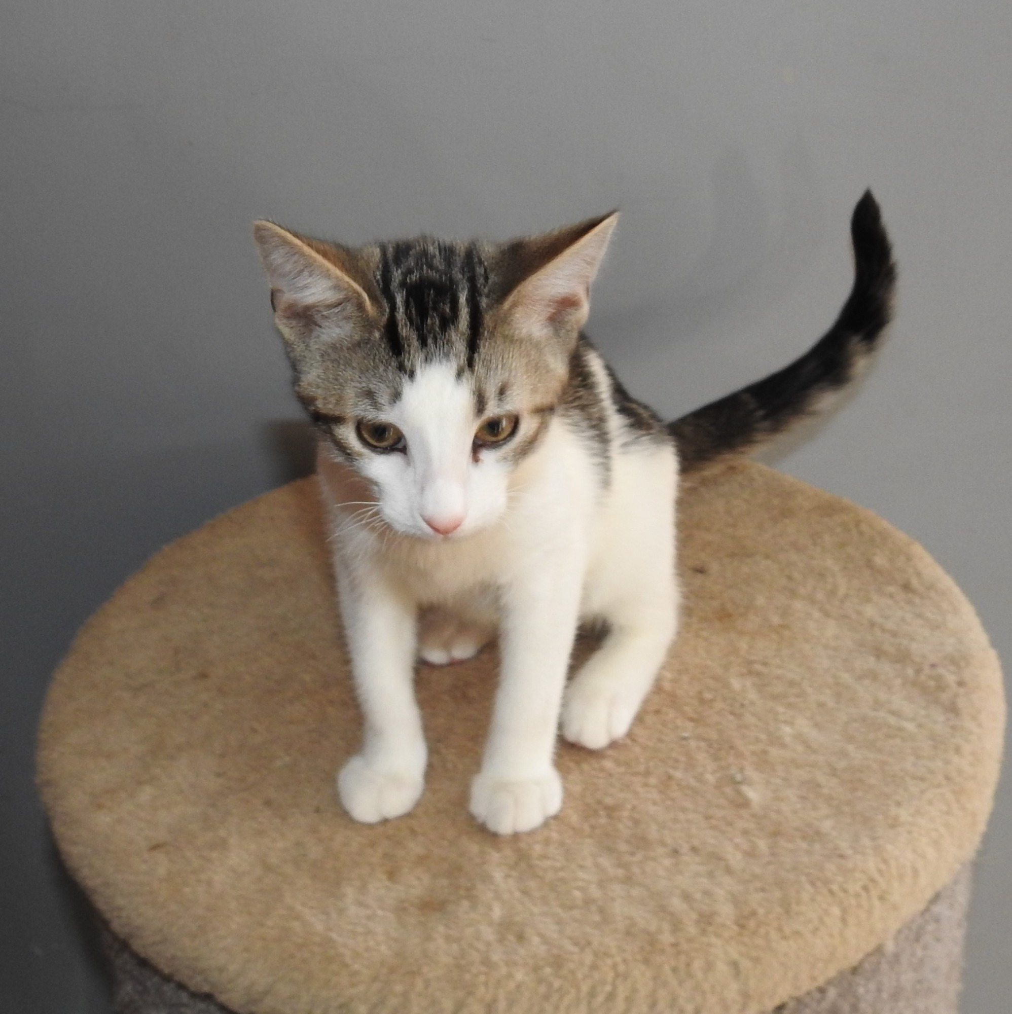 Toby is a placid kitten who enjoys a good pat and he purrs quickly for attention. He enjoys a good game of chasing a string but gets bored with it quickly. He can be quite adventurous and enjoys climbing things.
